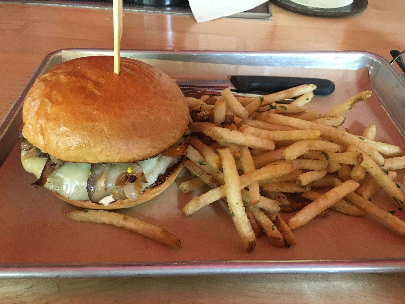 I found Hopdoddy burger bar and since I’m alone, the waiter offered to seat me at the bar. So I sat there, ordered one Impossible Cheesesteak with fries.